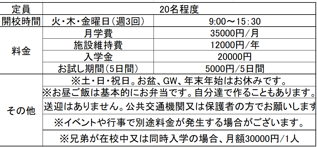 4歳~高校卒業まで※所持品の管理、衣類の着脱、排泄が自立しているお子様が対象です。その他は個別にご相談ください。